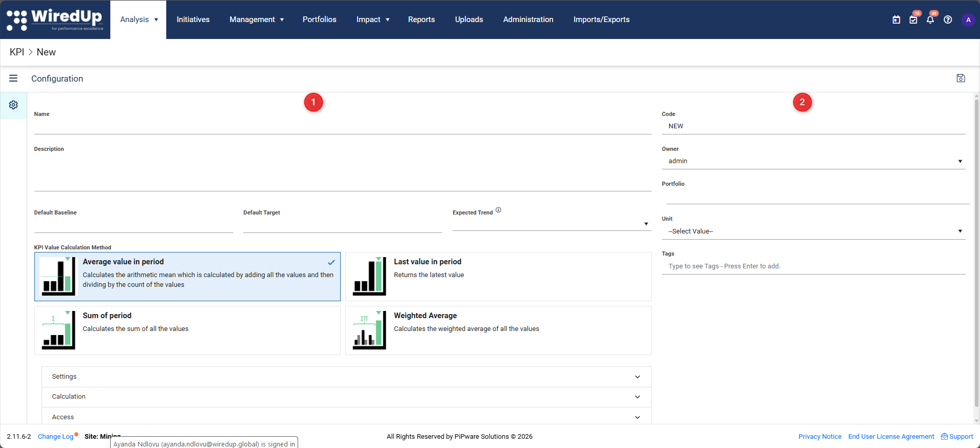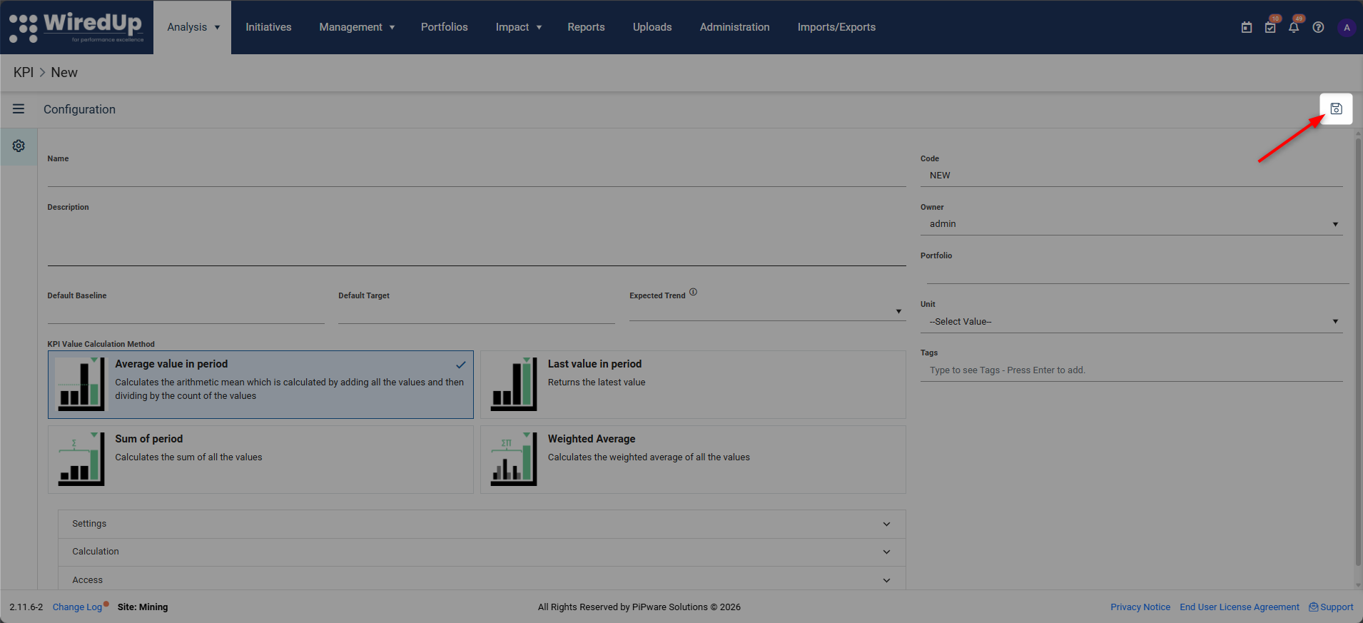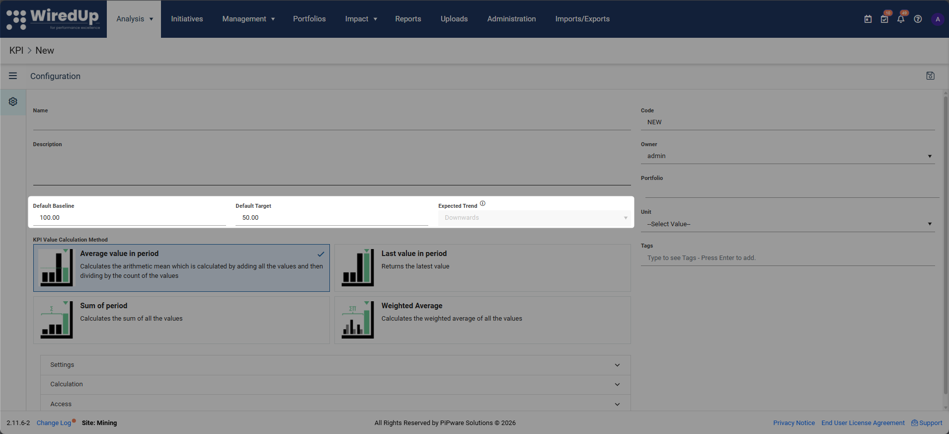 Select the appropriate calculation method for how the KPI should be computed. This determines how WiredUp will calculate and aggregate KPI values over time.