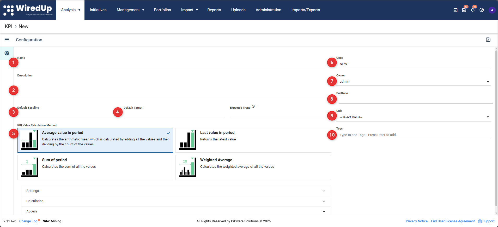 Tip: You can use KPI Sequences (configured in the Administration module) to auto-generate codes following your organization's naming conventions.
