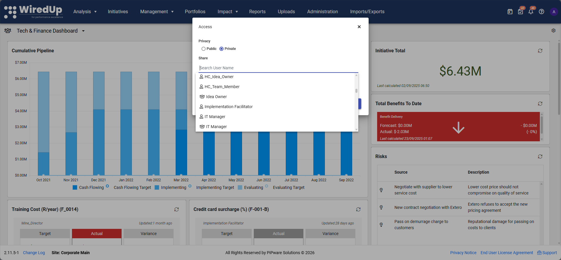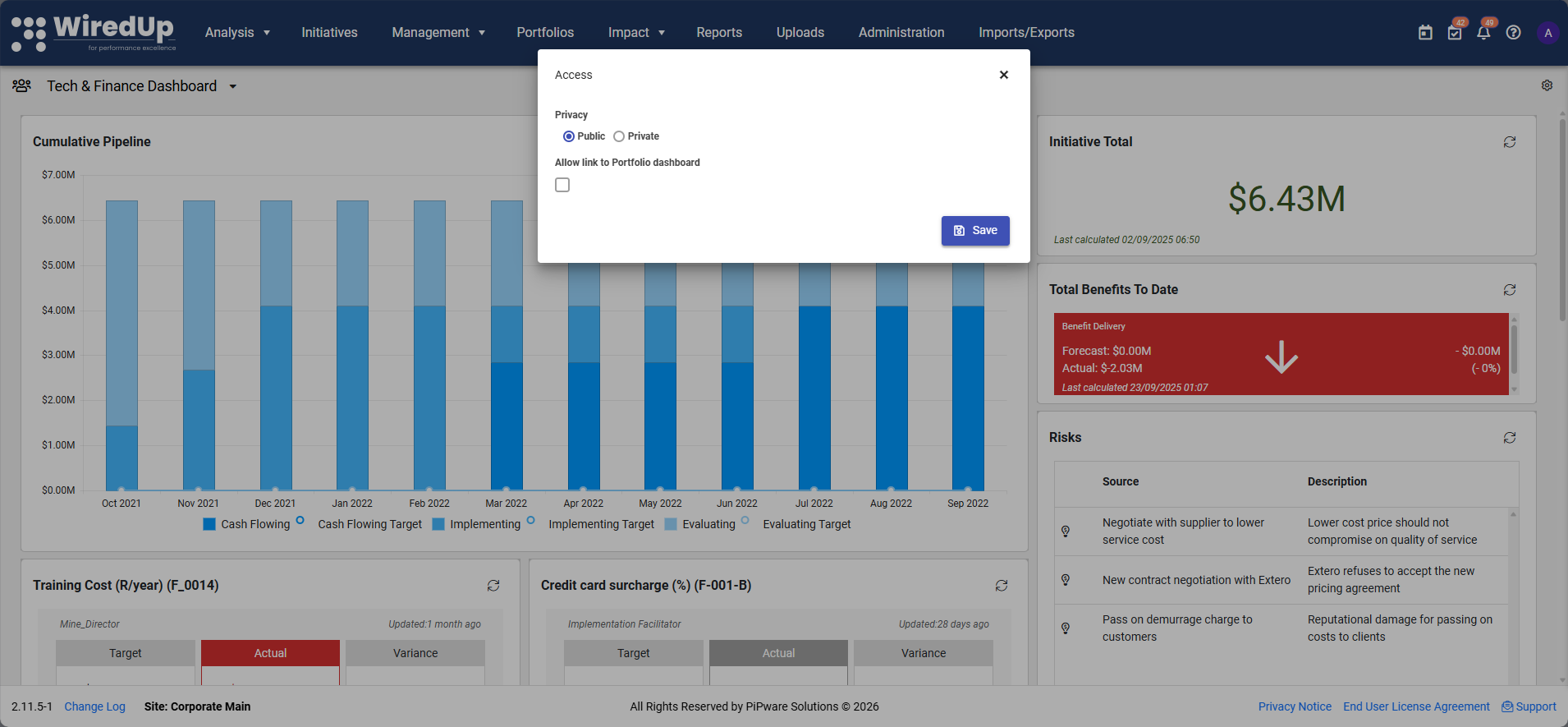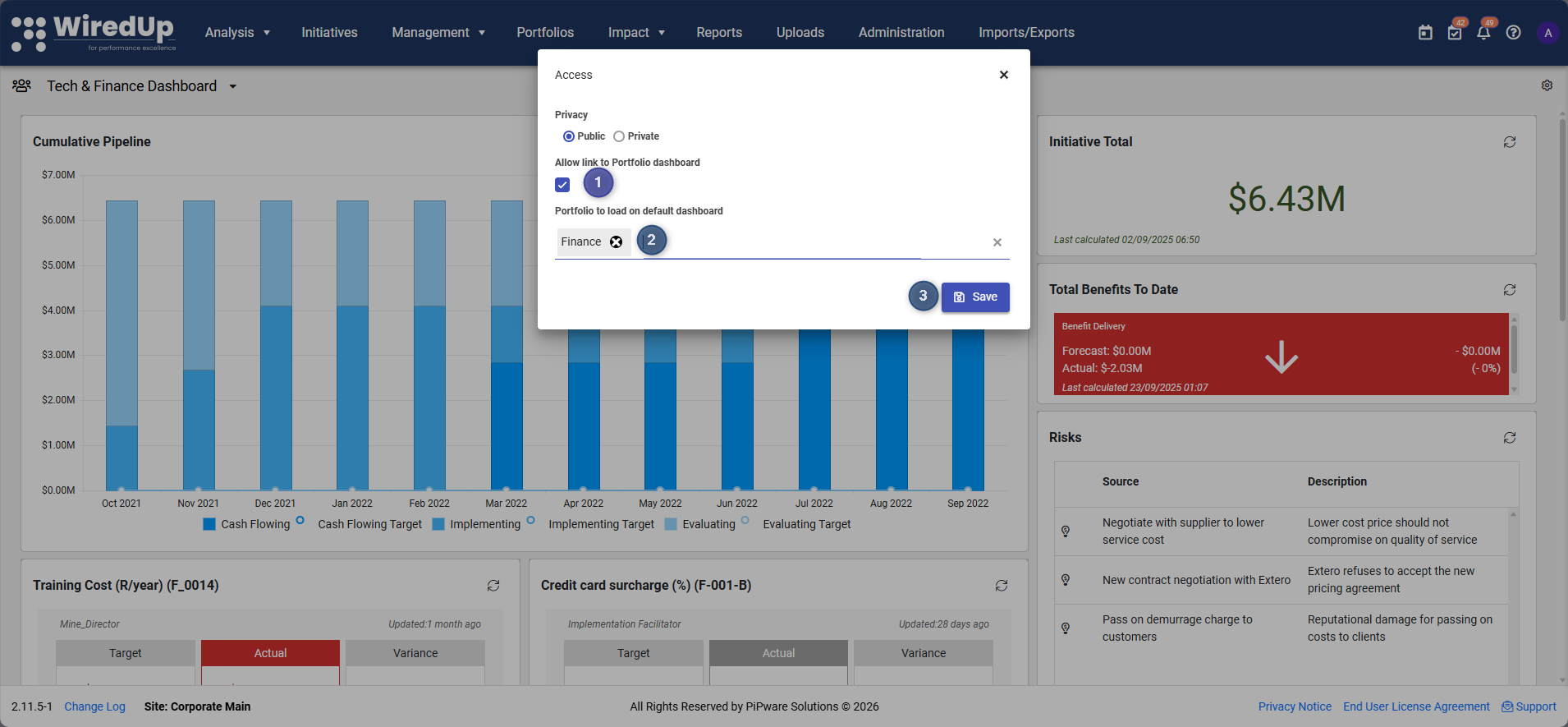 - Both Public and Private dashboards can be linked to a specific portfolio level, which applies default portfolio filtering to all widgets.