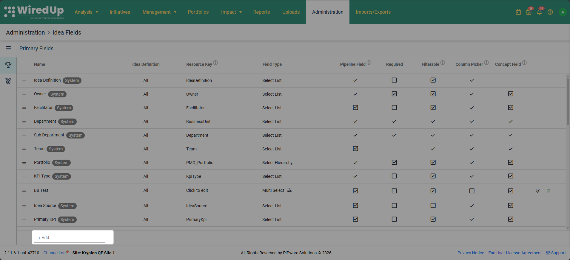 Idea Fields allow you to configure which fields are available when creating and managing Ideas/Initiatives in WiredUp. You can control field visibility, requirements, filtering capabilities, and display options. Fields can be organized into Primary Fields and Secondary Fields, which determine where and how they appear throughout the system. The system includes both system-generated fields and the ability to add custom fields tailored to your organization's needs.