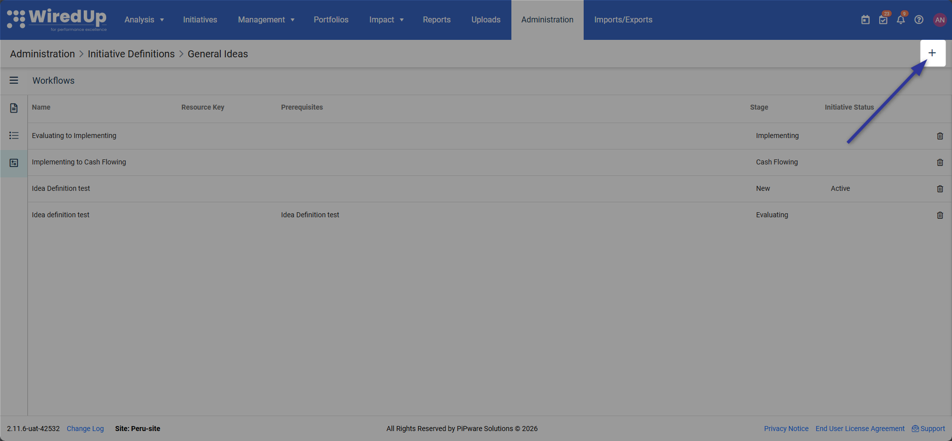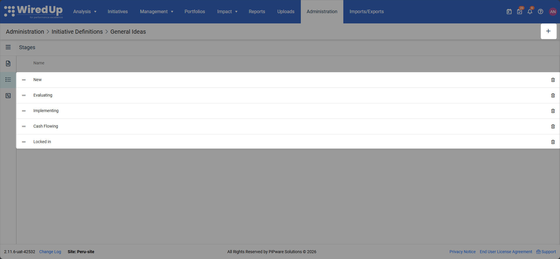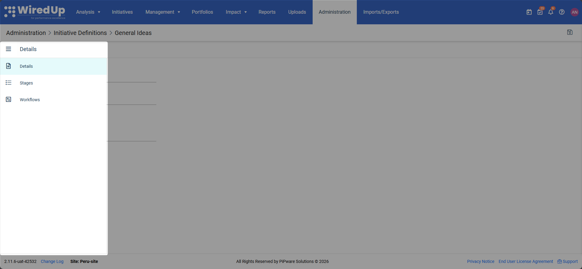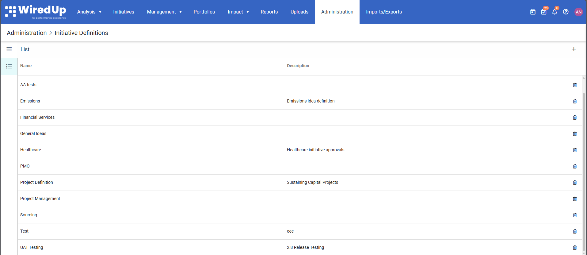 The Idea Definitions feature allows administrators to configure and manage the framework that governs how ideas and initiatives operate within WiredUp. An Idea Definition determines the specific set of stakeholders, workflows, stages, and approval requirements that apply to an idea throughout its lifecycle.