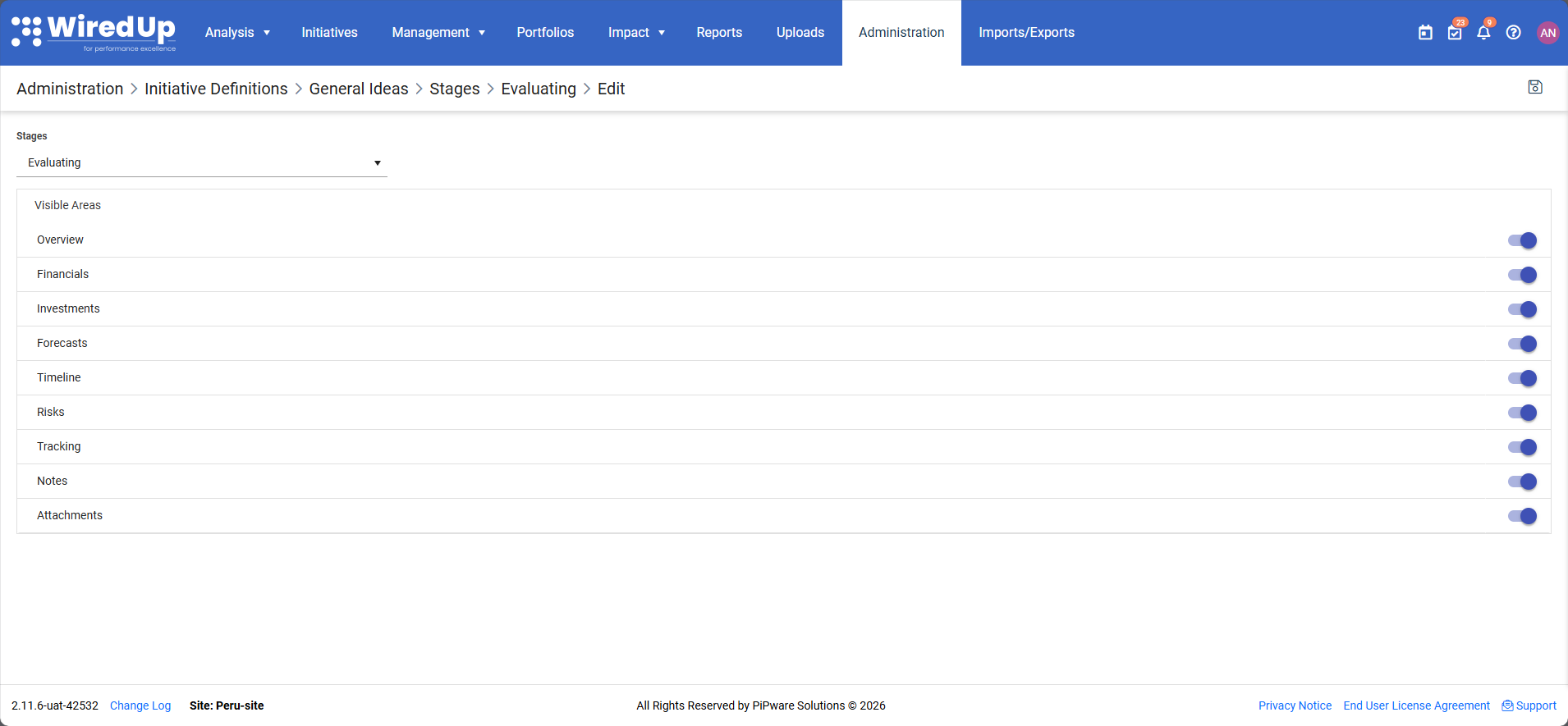 - Use the toggle switches to control which sections (areas) are visible to users at that stage: