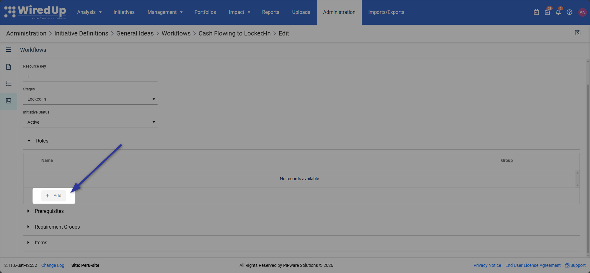 You can navigate to Workflows by selecting the Workflow option from the Ideas Definition menu. Roles defined within a workflow automatically become stakeholders for any Idea using that definition and are required approvers for the workflow.