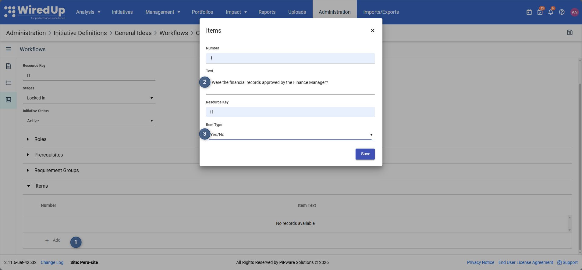 Items are the specific questions that must be answered before a workflow can be submitted for approval. To configure items: