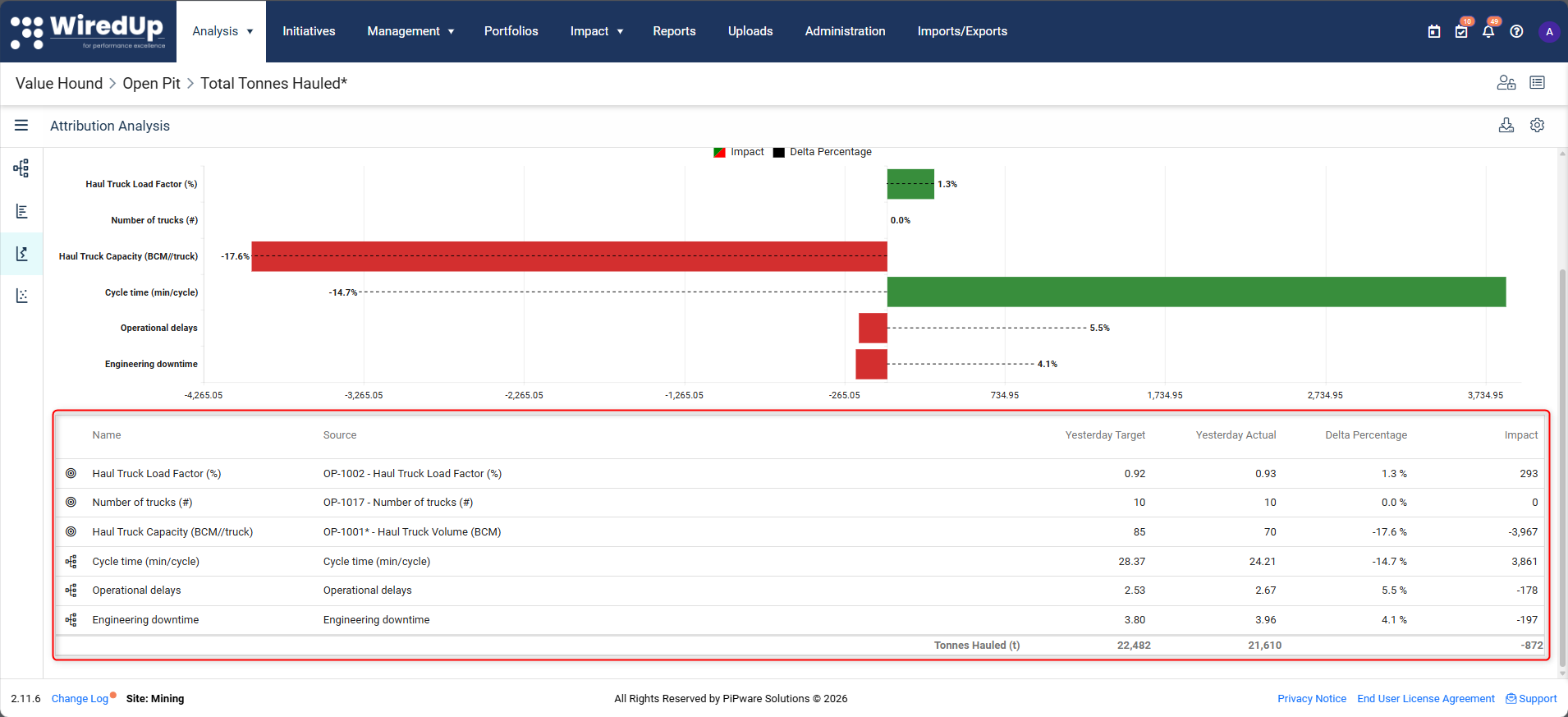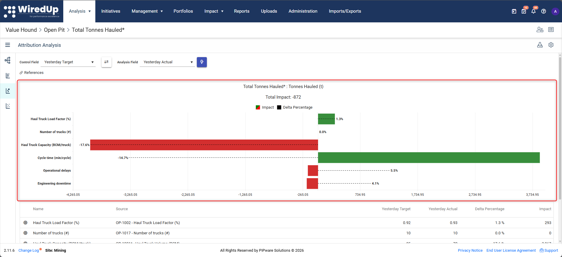 The total difference between the two fields is fully allocated across contributing KPIs.