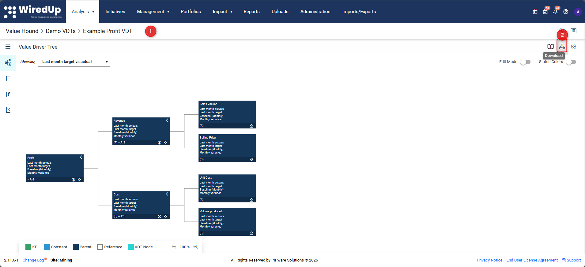 WiredUP allows you to export Value Driver Trees and analysis results for use outside the platform. Exporting is typically used to support reporting, presentations, and offline analysis.