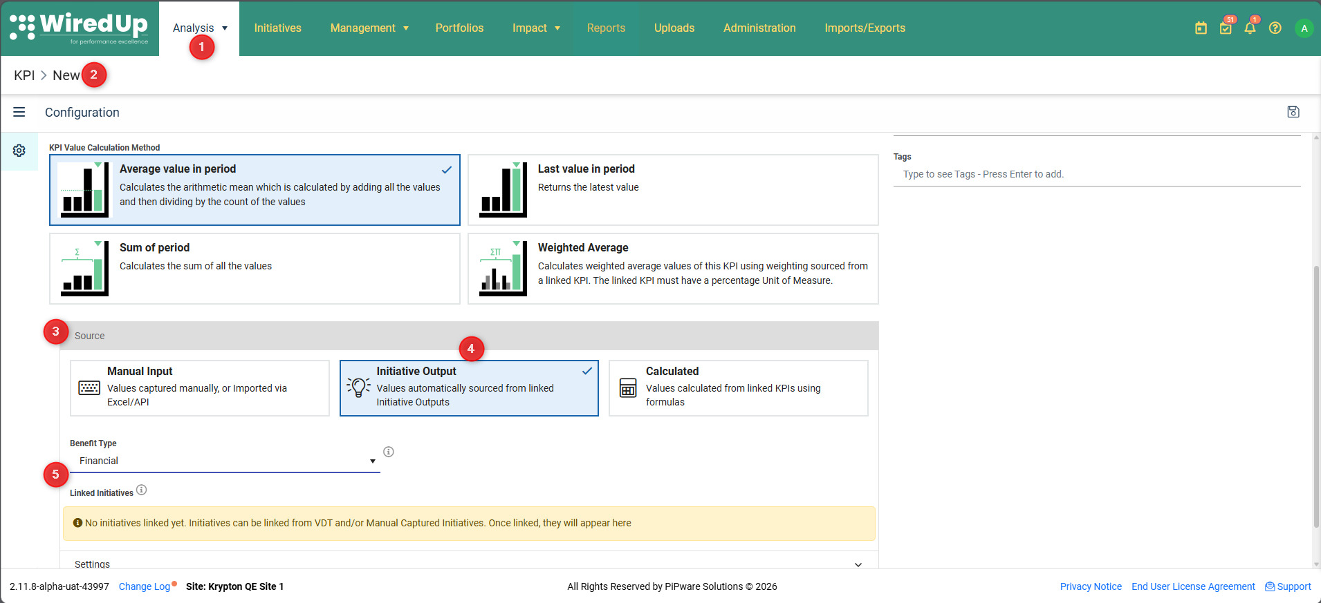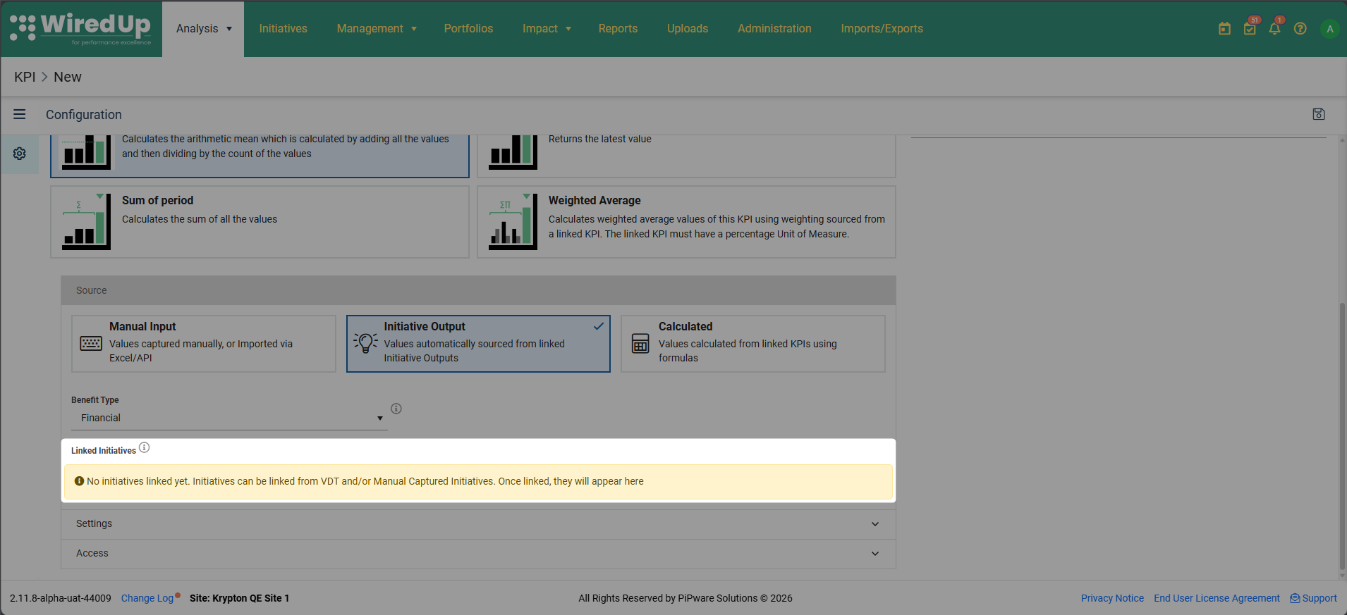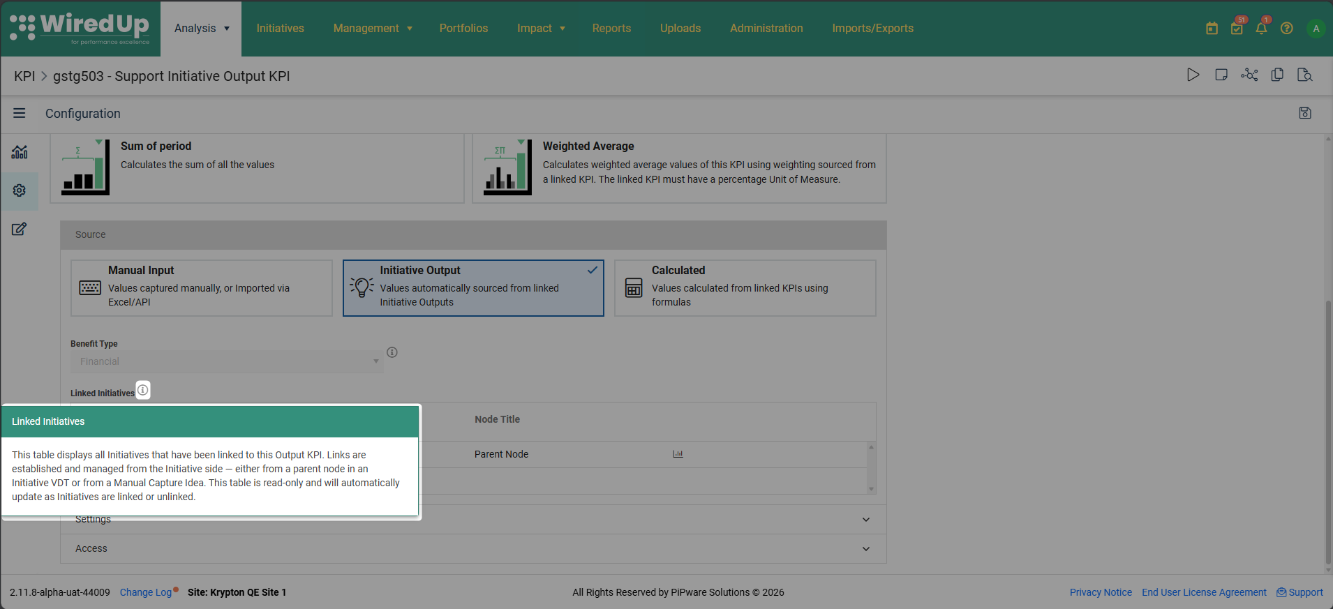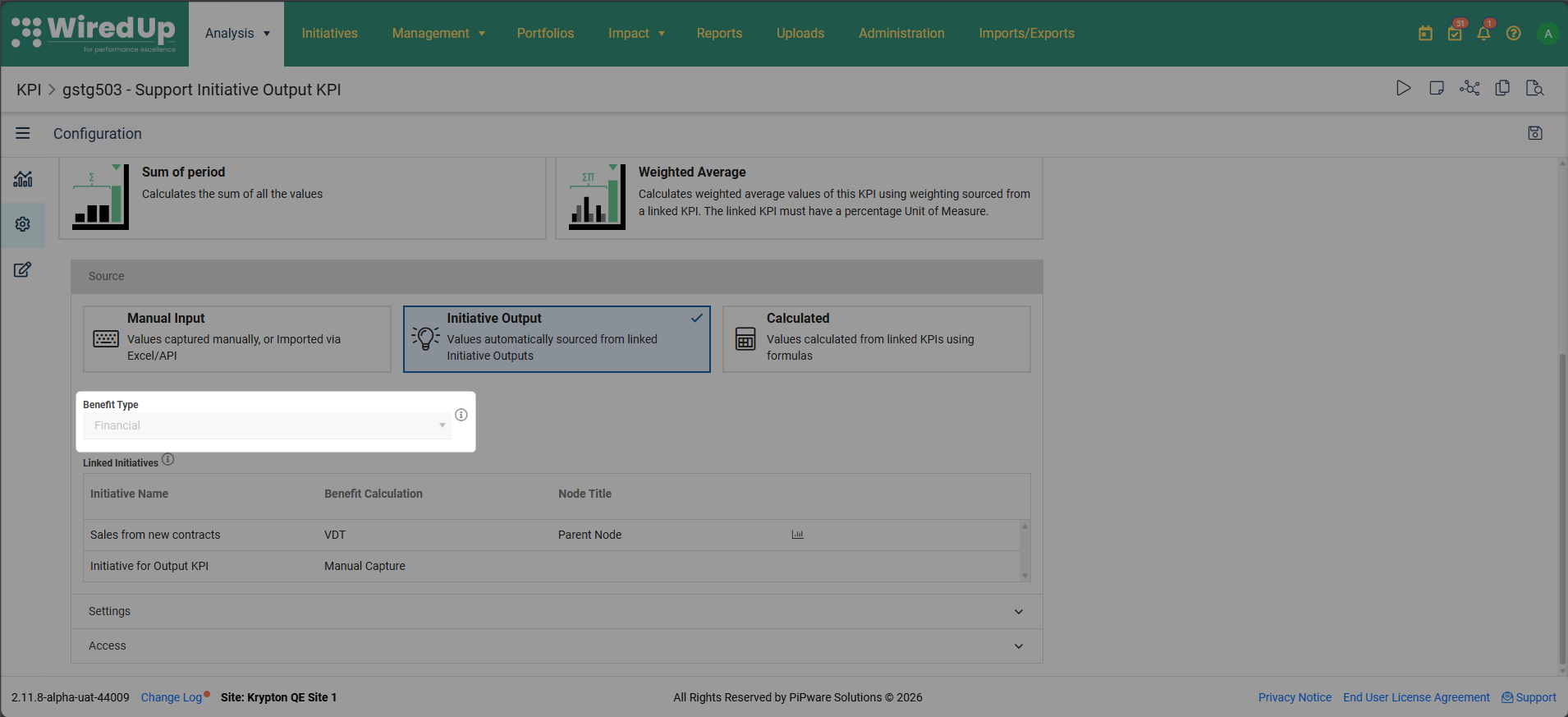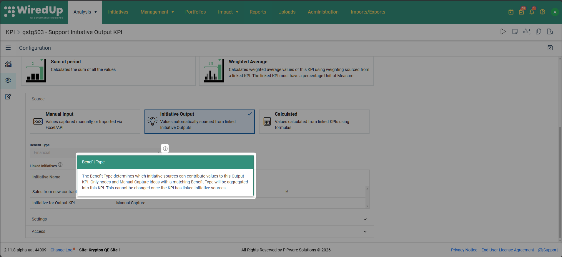 - Content: The Benefit Type determines which Initiative sources can contribute values to this Output KPI. Only nodes and Manual Capture Ideas with a matching Benefit Type will be aggregated into this KPI. This cannot be changed once the KPI has linked Initiative sources.