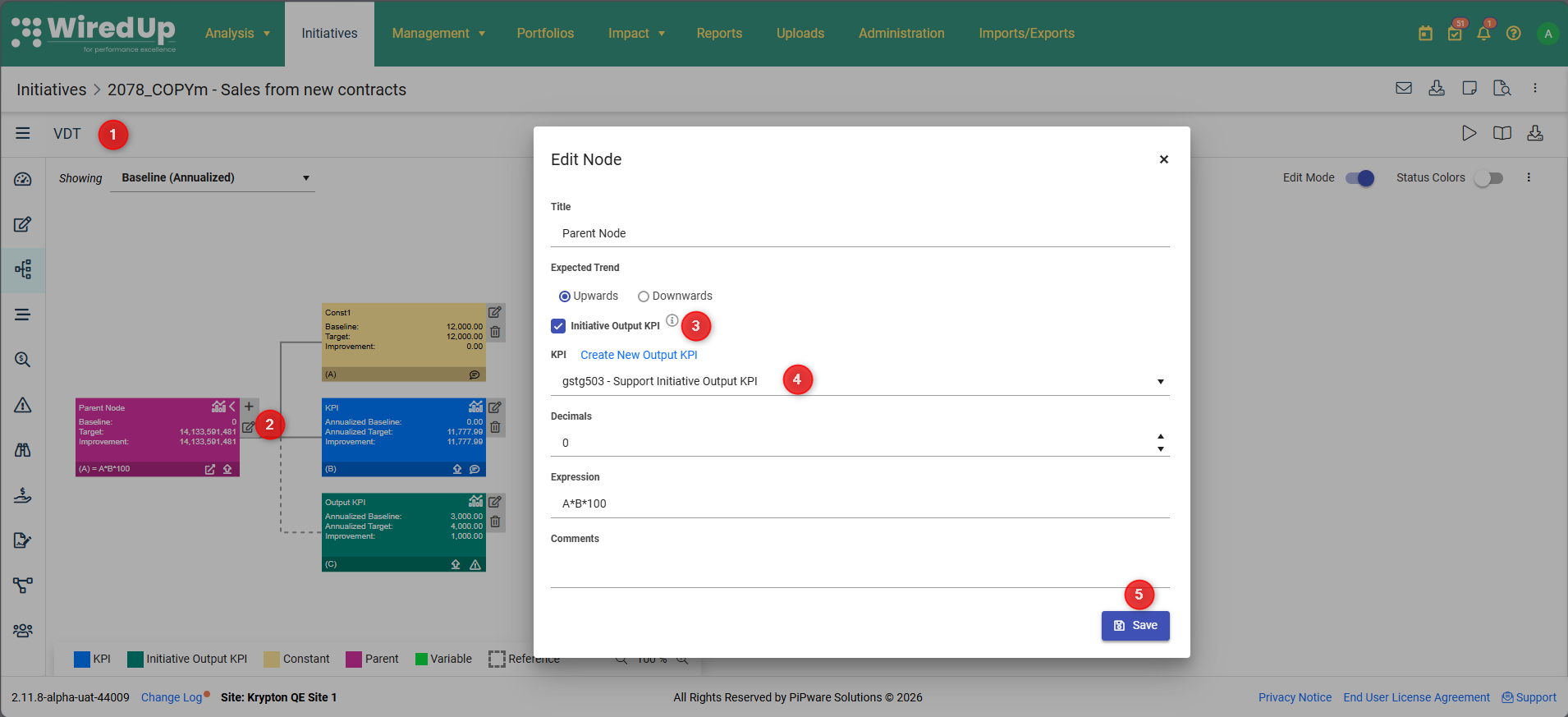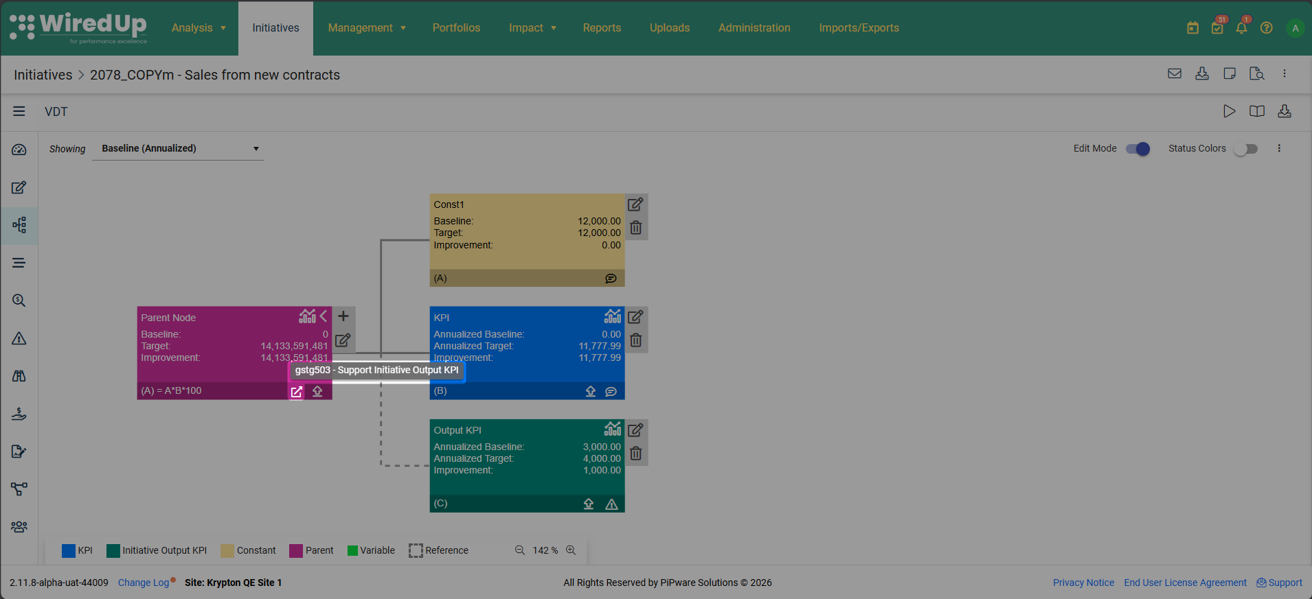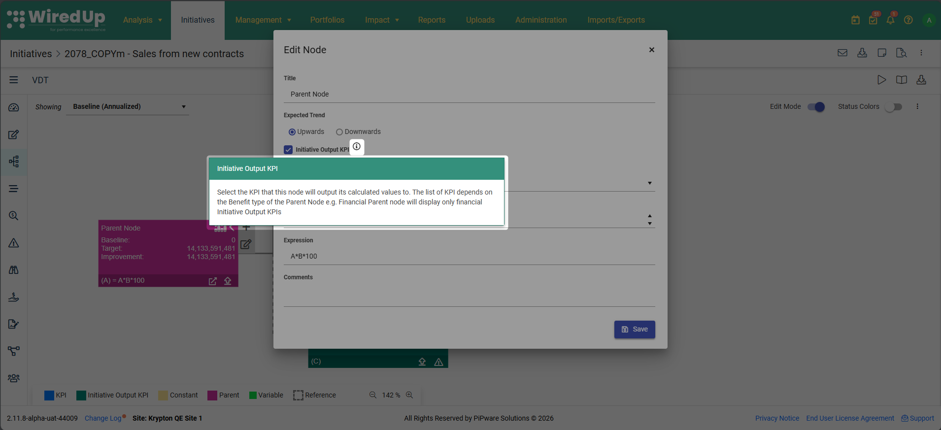 When working with VDT-based Initiatives, you can link a parent or root node's calculated benefit values directly to an Initiative Output KPI. This creates an automated data flow where the node's benefit calculations are automatically aggregated into the KPI.