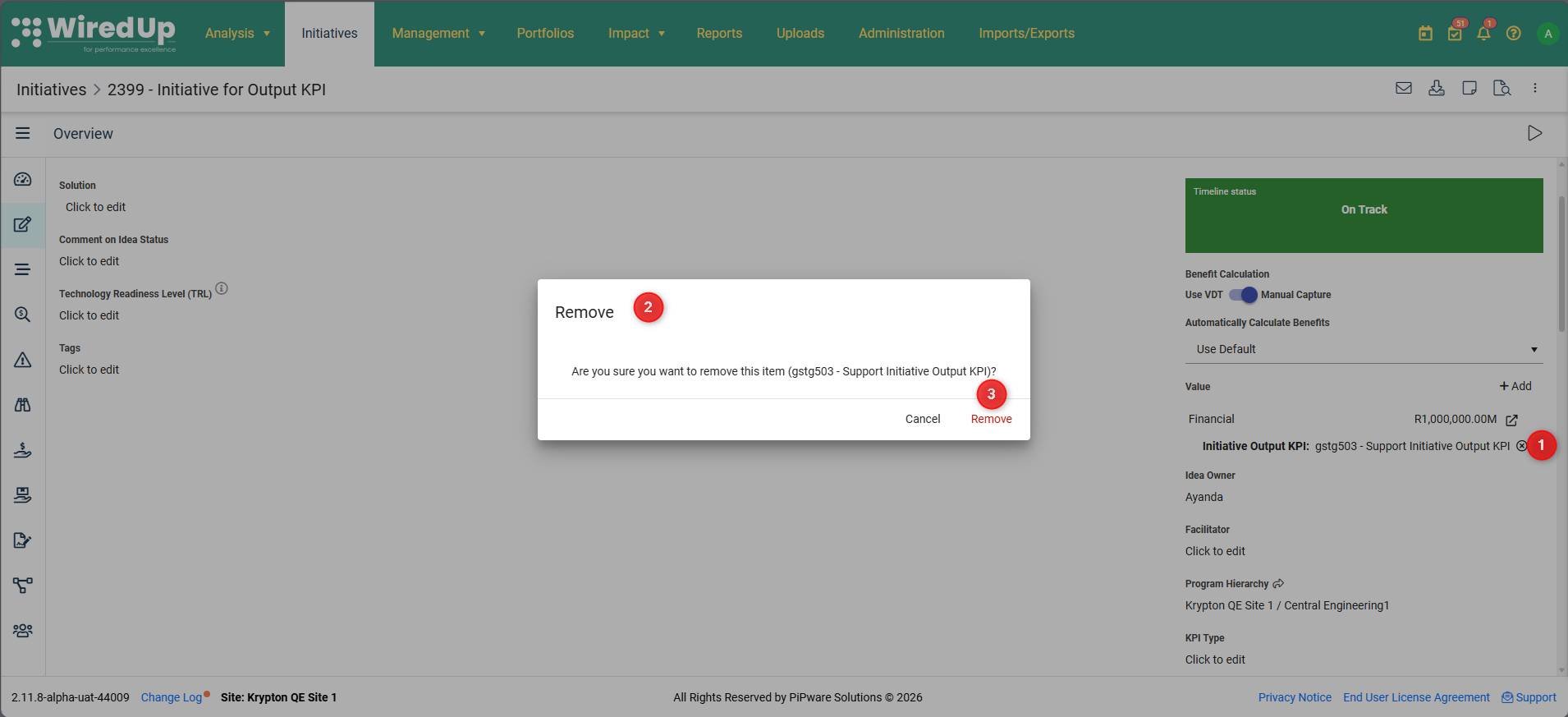 The system automatically prevents circular references when adding Initiative Output KPIs to Idea VDTs. KPIs that would cause a direct or indirect circular reference are filtered out from the dropdown and cannot be selected.