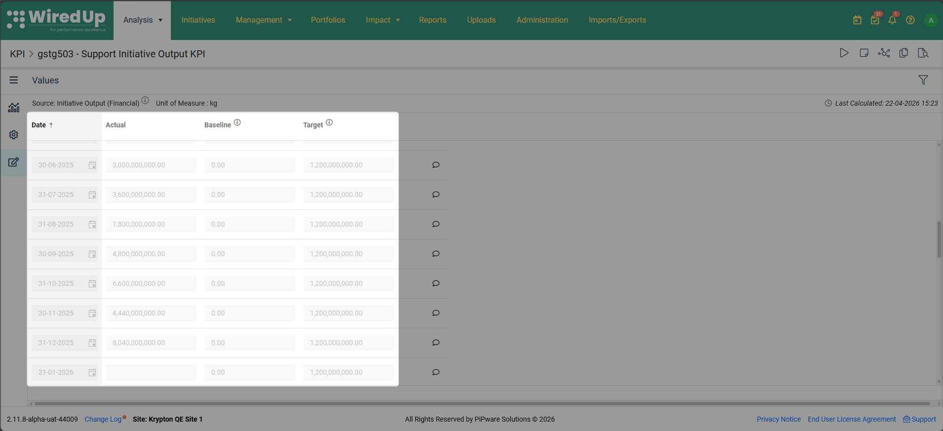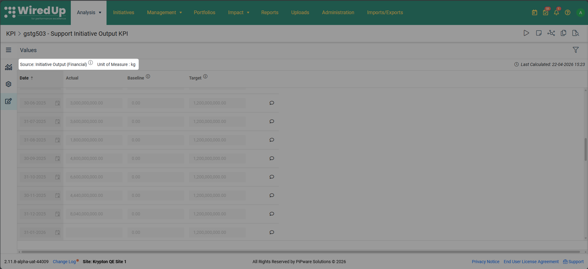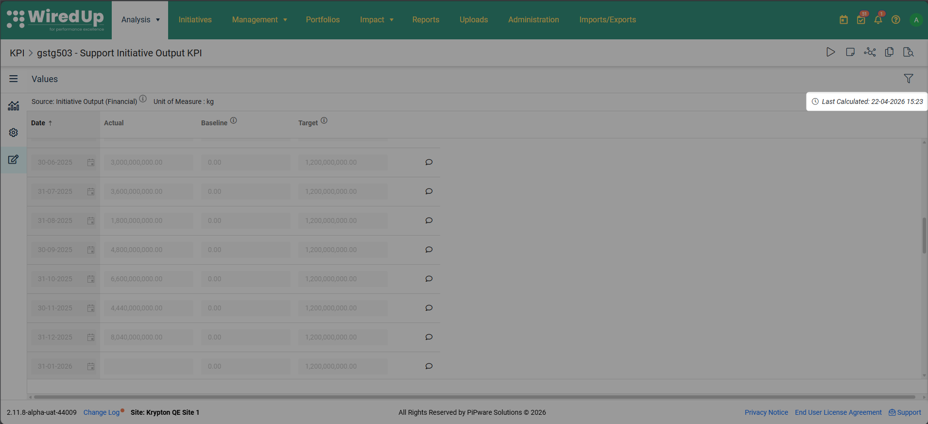 For example: "Last Calculated: 21 Apr 2026 09:15 AM" tells you that the values you're viewing reflect all linked Initiative data as of that specific date and time.