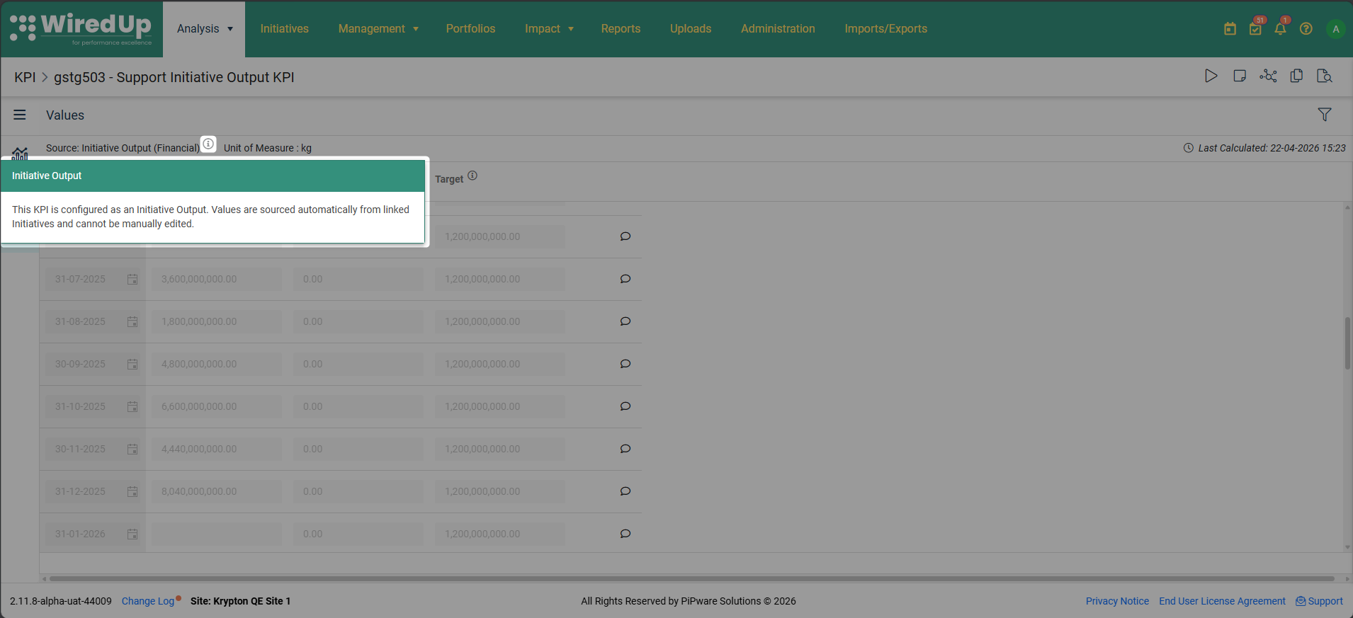 - Content: This KPI is configured as an Initiative Output. Values are sourced automatically from linked Initiatives and cannot be manually edited.