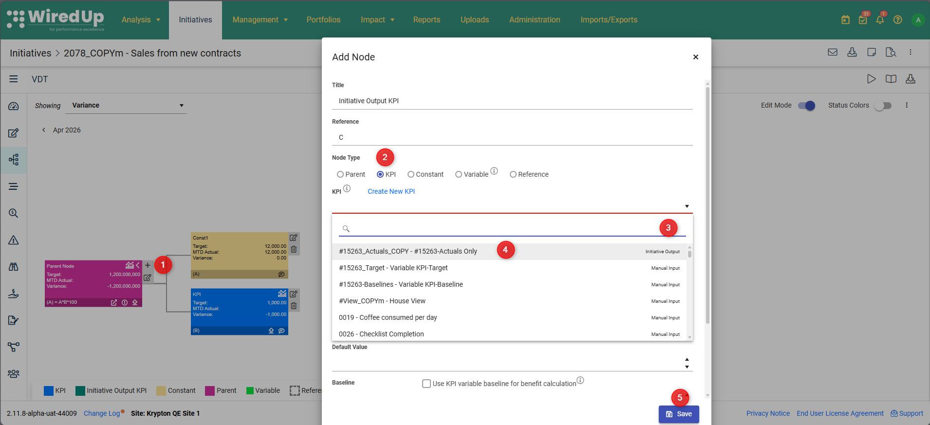 - Direct circular reference: If Idea VDT "A" has a parent node outputting to KPI 1111, you cannot add KPI 1111 back to Idea VDT "A" as a node