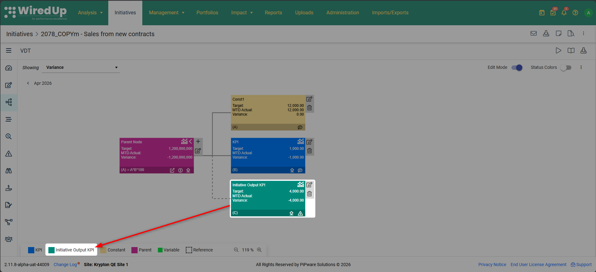 - The node renders in the configured Initiative Output KPI colour (default: Teal #00897B) instead of the standard KPI node colour, providing immediate visual differentiation