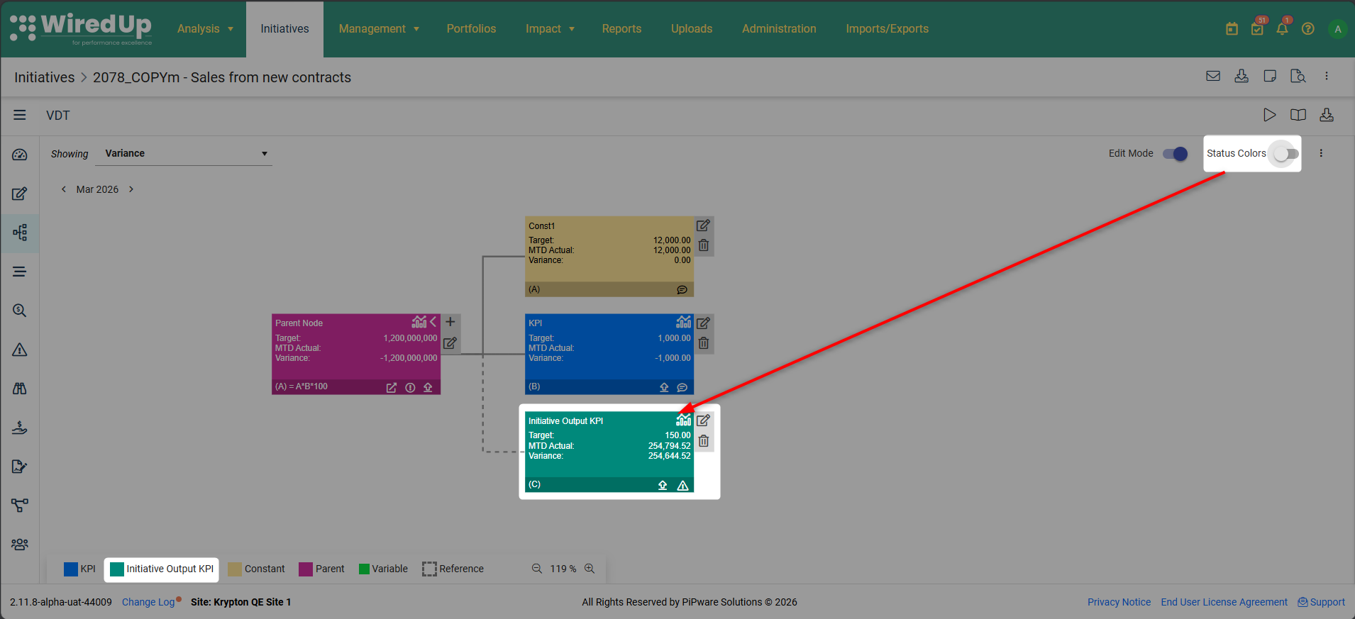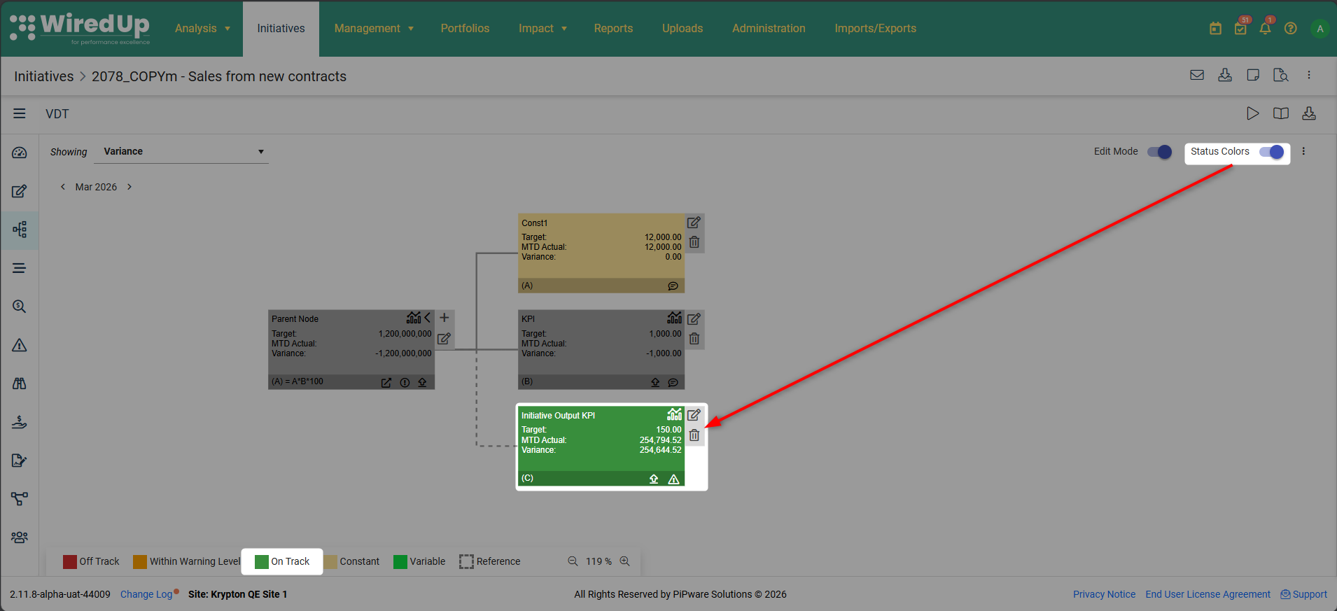 - When the Status Colors toggle is turned ON, the node renders in the standard red/amber/green status colour based on performance against targets, overriding the Initiative Output colour