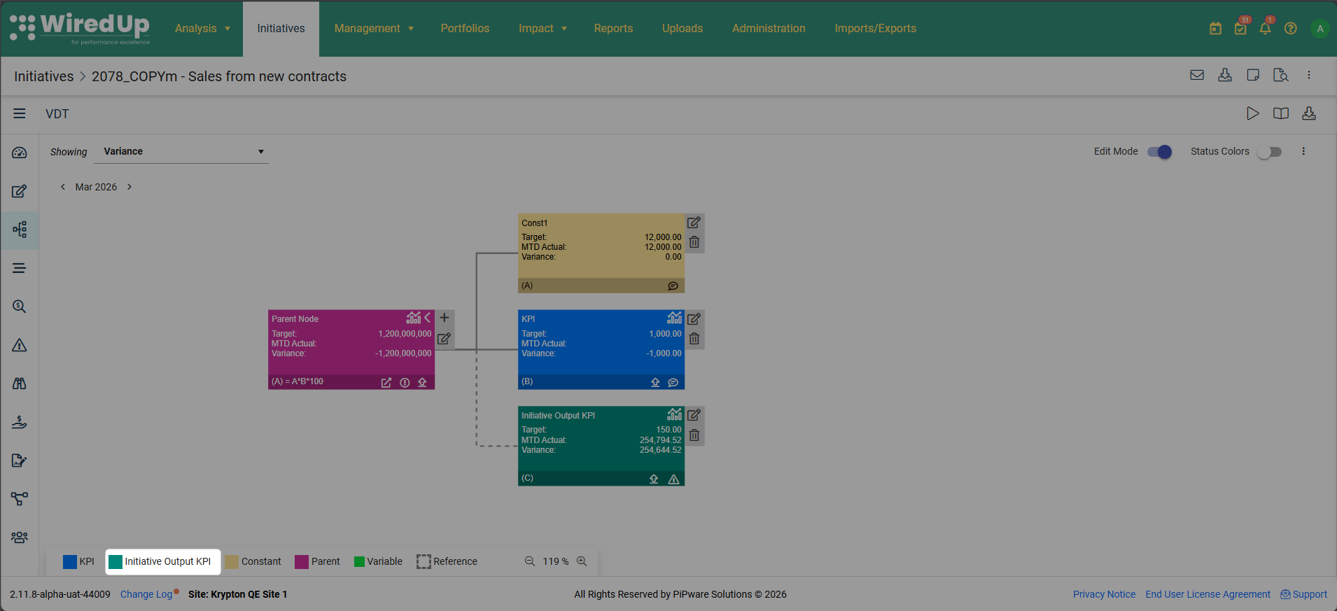 Initiative Output KPI nodes behave exactly like regular KPI nodes in Value Hound VDTs, with full participation in all Value Hound capabilities: