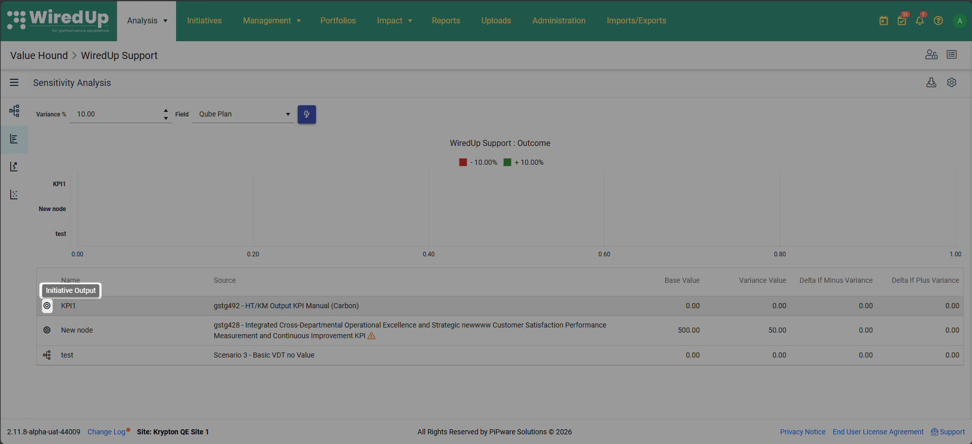 - Sensitivity Analysis — The Initiative Output KPI appears as a row in the sensitivity table and as a bar in the tornado chart, showing how changes to this KPI impact the overall outcome. This helps you understand the relative importance of the aggregated Initiative portfolio metric.