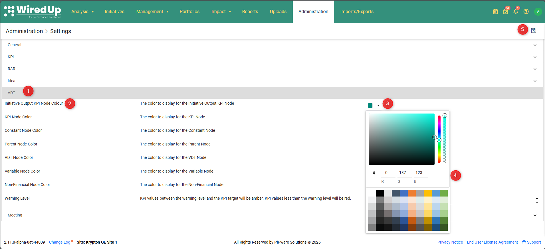Note: The Initiative Output KPI node colour setting is shared across both Idea VDT and Value Hound VDT. There is no separate colour setting for each VDT type — changing the colour in Administration → Settings → VDT affects both VDT types simultaneously. This ensures visual consistency across your entire WiredUp environment.Permissions