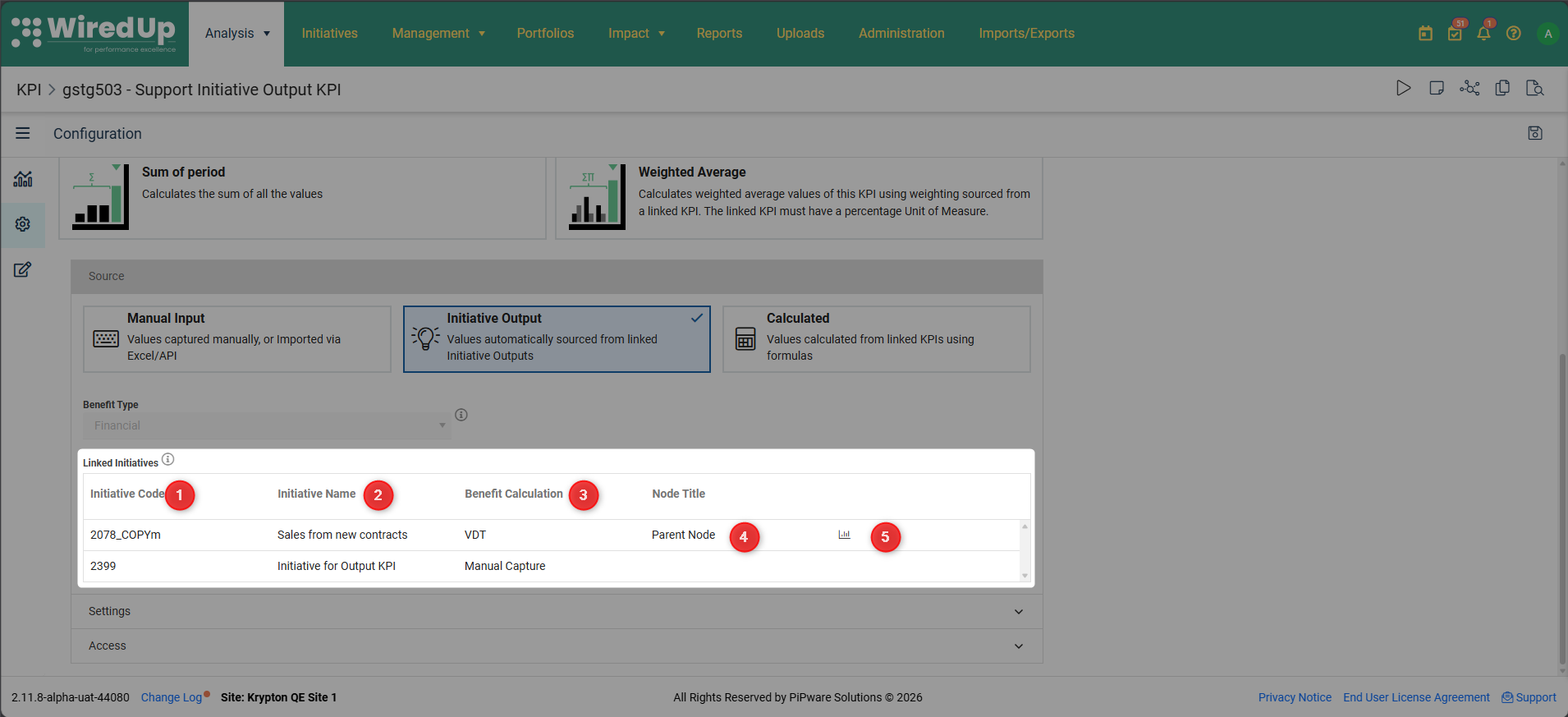 - Complex Formulas: If you need to perform mathematical operations beyond simple summation (e.g., weighted averages, ratios, conditional logic), use Calculated KPIs instead. Initiative Output KPIs only support straightforward aggregation (summing) of values from linked Initiatives.