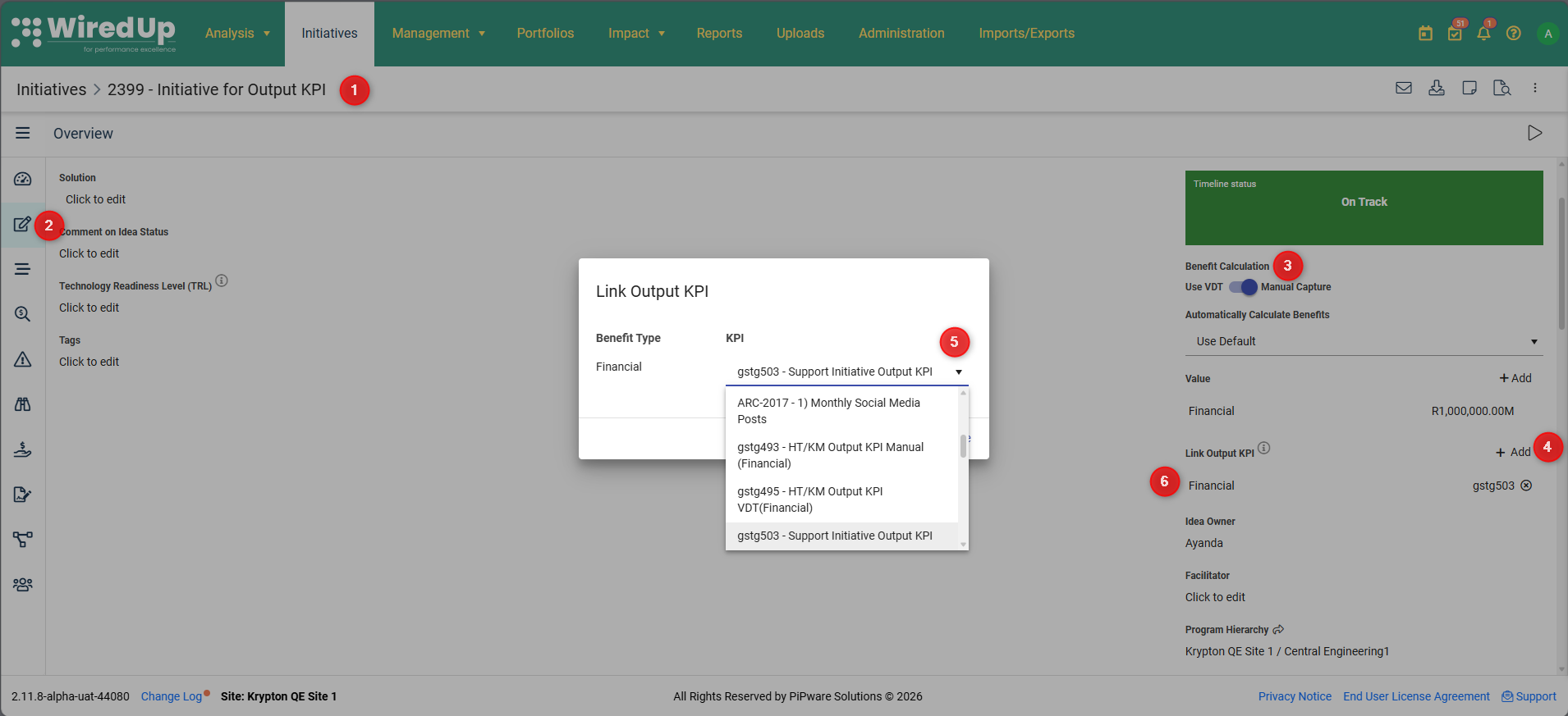- The KPI must be linked to a parent/root node in an Initiative VDT, or to a Manual Capture idea's benefit value