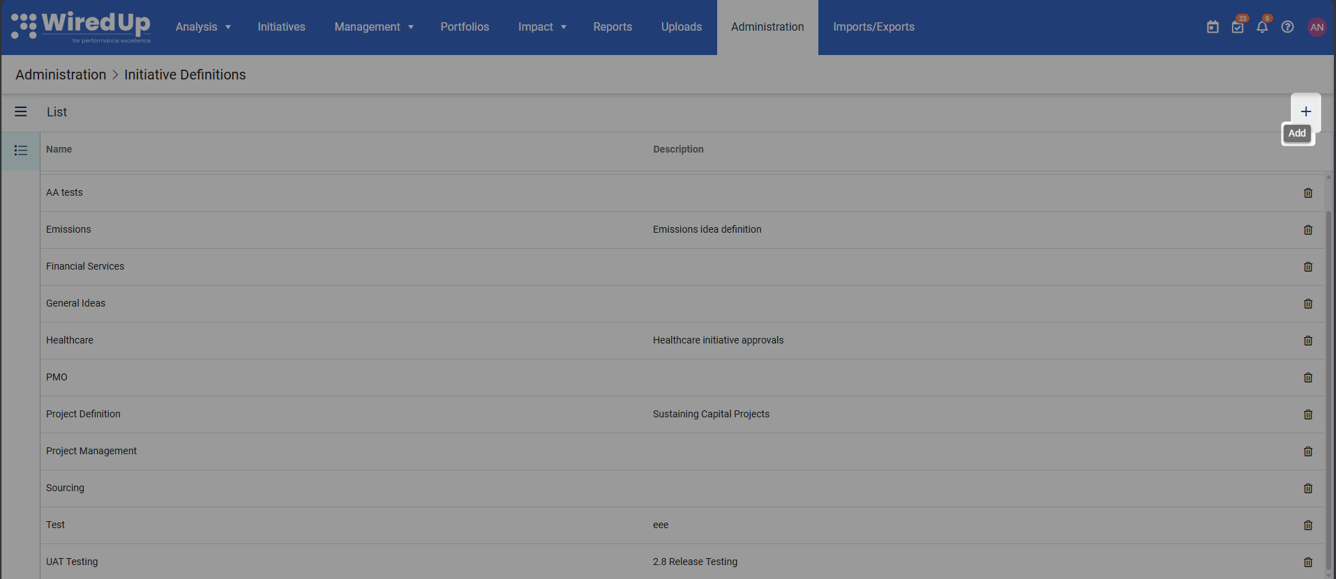 La función Definiciones de ideas permite a los administradores configurar y gestionar el marco que rige el funcionamiento de las ideas y las iniciativas dentro de WiredUp. Una definición de idea determina el conjunto específico de partes interesadas, flujos de trabajo, etapas y requisitos de aprobación que se aplican a una idea a lo largo de su ciclo de vida.