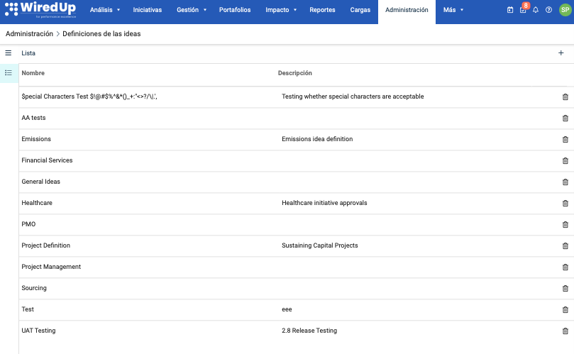 - Hacer clic en el icono de la papelera para eliminar una definición de idea (si no está en uso).