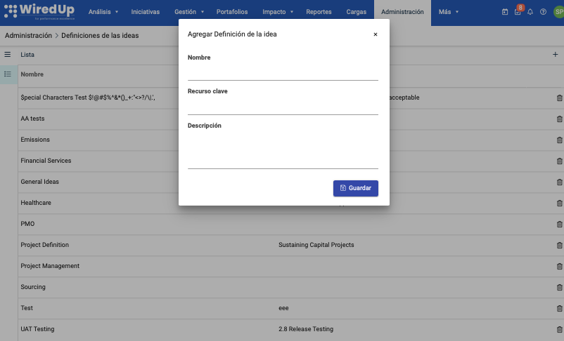 - Hacer clic en el botón +Añadir para crear una nueva definición de idea.