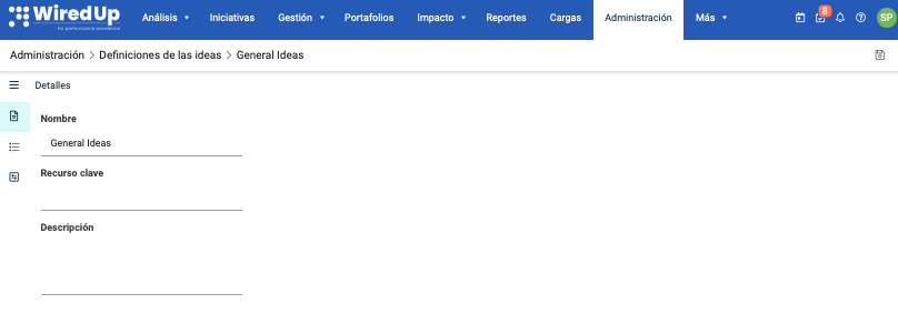 - Se abrirá la pantalla Editar definición de idea, que muestra las siguientes secciones editables en el menú Detalles: